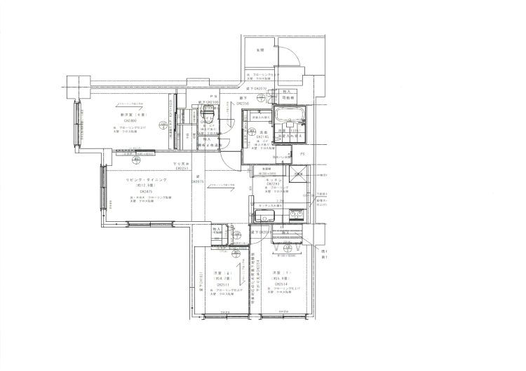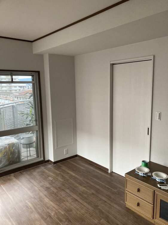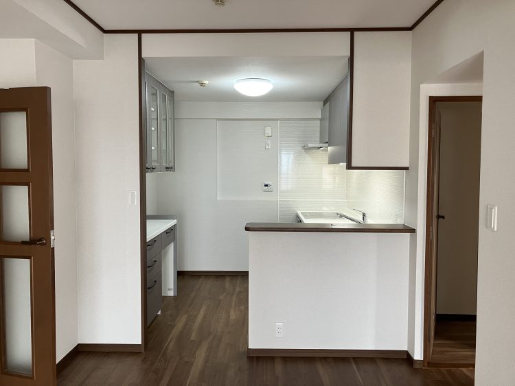 マンションのためキッチンの配管が自由にはならないため、新しいキッチンの配管スペースを取るため壁をふかし、シンクの位置をLD側に配置。